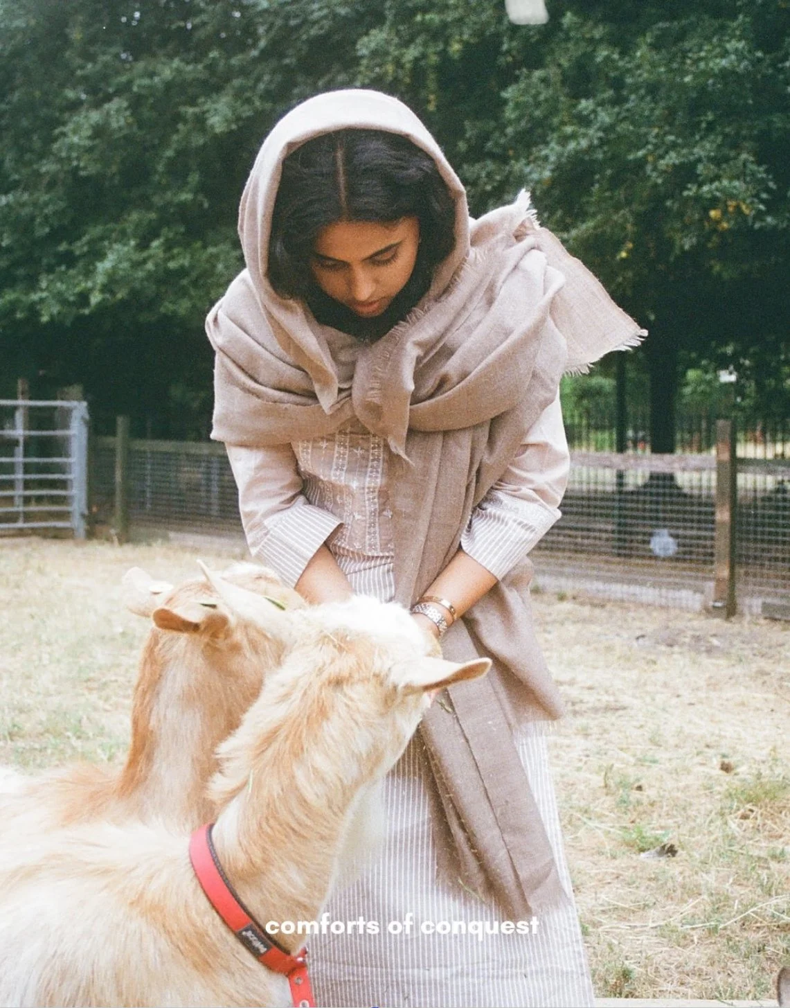 Her Comforts of Conquest series explores the colonial and ecological impacts of natural fibers like pashmina, sourced from Changthangi goats in Ladakh and handwoven by Kashmiri artisans. Utilizing 35mm photography as well as archival and material research, she traces the extractive history of one of the world’s most luxurious fabrics. Imperial British trade, she notes, made massive profits off pashmina by marginalizing the indigenous labor that produced it. Her current project explores the effects of colonization and climate change on endangered craft and artisan communities in India.